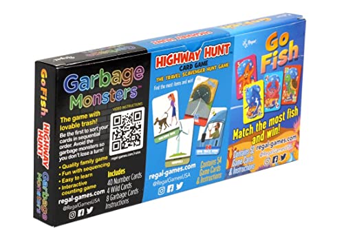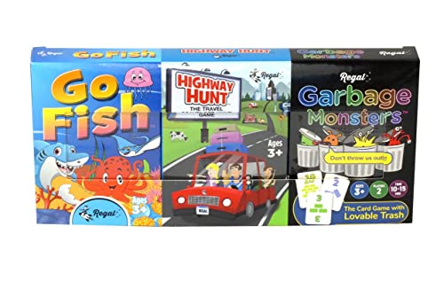 - THREE GAME BUNDLE - This Regal Games 3 pack of card games features Go Fish, Garbage Monsters, and Highway Hunt. Go Fish is the classic matching game, Garbage Monsters is a fast paced sorting game and Highway Hunt is a classic search and find game redesigned for on the road.